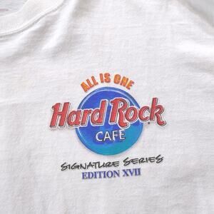 A rad throwback to the 90s! This Hard Rock Cafe tee features a white color, a classic crew neck, and the Signature Series XVII design. Thrasher shirt with some distressing like small holes, faint spots and wear on the crewneck giving it the authetic grunge vibe. A must-have for any collector or fan of vintage music memorabilia. Perfect for casual wear or adding a retro vibe to your outfit.