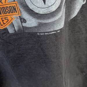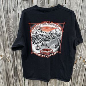 Mens size XXL Harley Davison vintage t-shirt. Single stitch, made in USA, double sided, size does matter, eagle flame graphic on front, Greeley Colorado Mining Cycle Center, 1991. Good condition, see photos, faded spot on front.