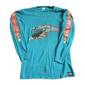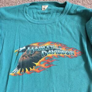 Vintage 90s Harley Davidson Teal Thermal Waffle Knit Top XL Flames Eagle 1993