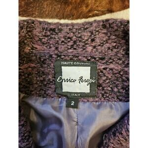 Step back in time with this stunning vintage 90s Haute Couture blazer from Enrico Ferezi, Italy. This purple knit blazer features a unique textured design that adds a touch of sophistication to any outfit. The size 2 fit is perfect for a tailored look.