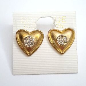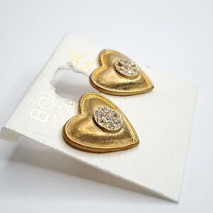 Vintage 90s Heart Earrings Clear Rhinestone Matte Goldtone Love Valentine