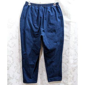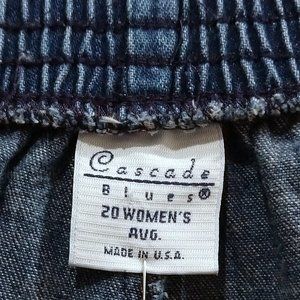 A pair of Cascade Blues jeans, in size 20 Women's Avg. Vintage, from the early 1990s! Dark wash, high waist for that classic vintage style. Stitched elastic waist, relaxed fit. Two big side pockets. 100% cotton, machine washable, made in USA. 19.5 inch rise, 28 inch inseam, 34 inch waist unstretched, 42 inches fully stretched.