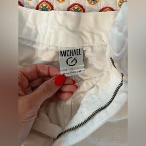 Very cute Vintage 90s High Waist Distressed Eyelet Ruffle White Shorts Michael G Size 5, one tiny stain near zipper as shown in pictures. I unfortunately tried to treat it and it wasn’t coming out. Not very noticeable considering where it’s located. See measurement dimensions in pictures.