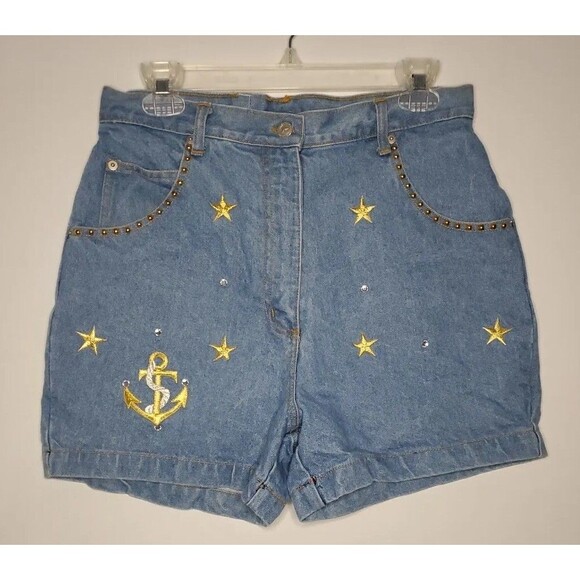 Vintage High Waist Mom Jean Shorts Coastal Retro Nautical Sailing Anchor Stars Embroidered Studded