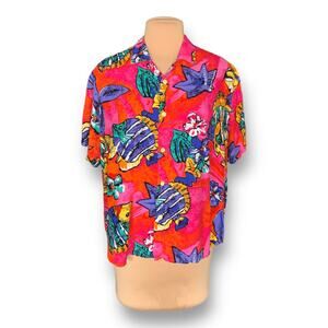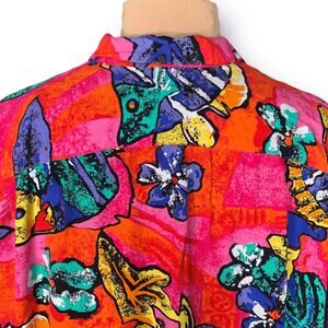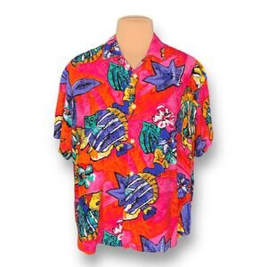 Vintage 90s Hilo Hattie Hawaiian Shirt Bright Tropical Fish Print Short Sleeve