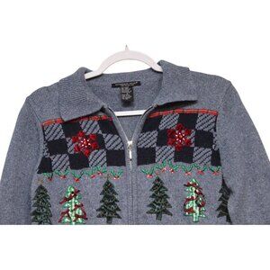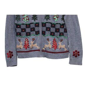 Vintage 90s Holiday Christmas Sweater Small Ramie Wool Zip Embroidered Beaded
