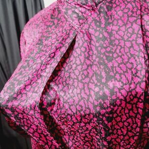 DETAILS: Unlined non sheer, long button sleeves, pleated skirt, Elastic waist, back buttons, shired top front, dry clean, made in Korea