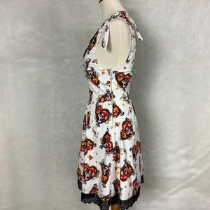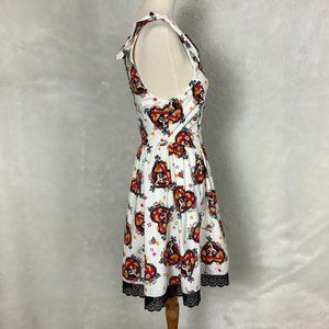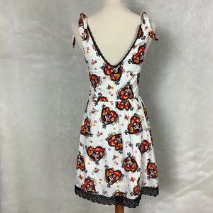 This is a sleeveless, retro, ivory dress with a lace hearts and Day of the Dead La Catrina print from The Book of Life Collection for Hot Topic. Black lace trim. Adjustable tie shoulder straps. Cotton, spandex fabric. Lined. Side zipper. No flaws. Size 6 mannequin. twee, fairy, whimsy goth, Catrina, skull. Cotton, spandex fabric.