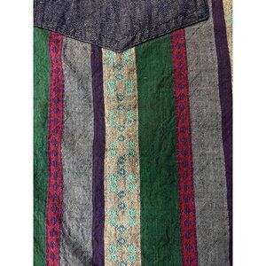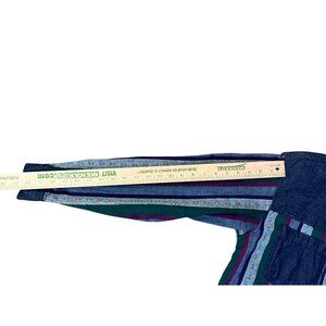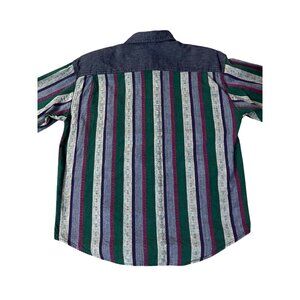 Add retro flair to your wardrobe with this vintage 1990s Huntington Ridge denim blouse. Made from soft cotton, this piece features striped panels in teal, burgundy, and navy, with denim shoulders and chest pockets that give it a distinctly early ‘90s look. The light shoulder pads add a flattering, structured shape typical of that era.