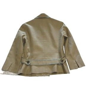 The jacket is lined with rayon, making it suitable for all seasons, and is available in size 4. The jacket is pre-owned but in excellent condition. This short-length jacket with long sleeves can be paired with different outfits to create a classic or 90s-themed look. Care instructions recommend dry clean only.
