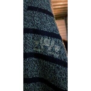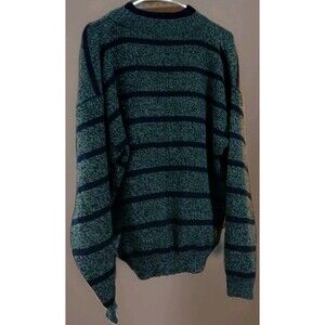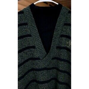Authentic vintage 1990s IOU mens v-neck sweater in deep green and black horizontal stripes.