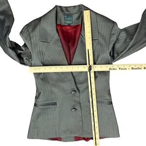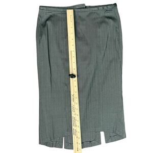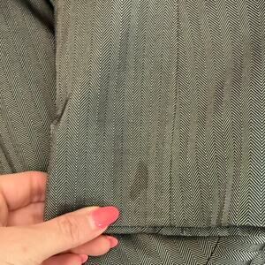 Acetate, nylon, lycra blend. Gray herringbone pinstripe pattern. Double vented pencil skirt with a center back zip. Two button single breasted blazer. Pockets in front decorative only. Ornate silver / pewter buttons. Single back pocket on the skirt.