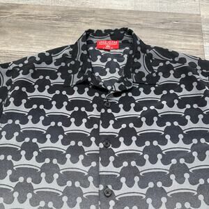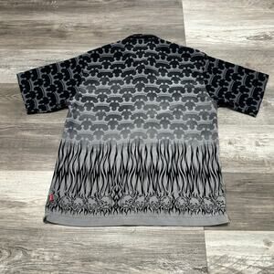 Vintage 90s Y2K JNCO Jeans Skull Flame Crown AOP Black Grey Mens Medium Short Sleeve Button Up Shirt