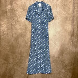 Vintage 90s Jaclyn Smith Blue Floral Print Button Up Shirt Waist Maxi Dress