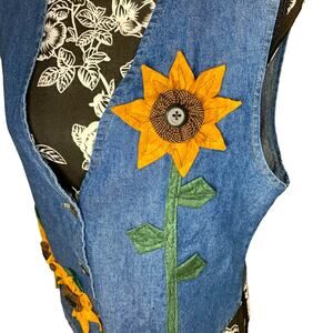 Vintage 90s Jean Vest with Sunflower patchwork/button detailing by Sunbelt. 100% Cotton! Kinda giving me hippie or Ms. Frizzle vibes!