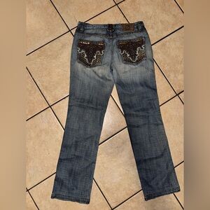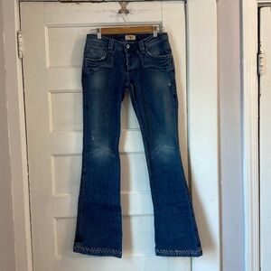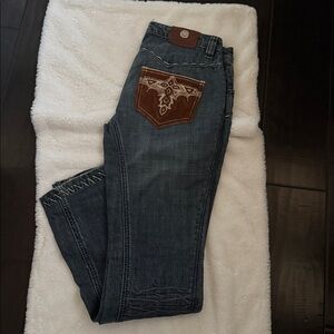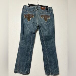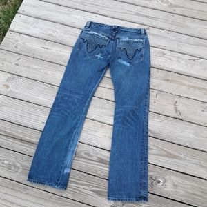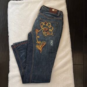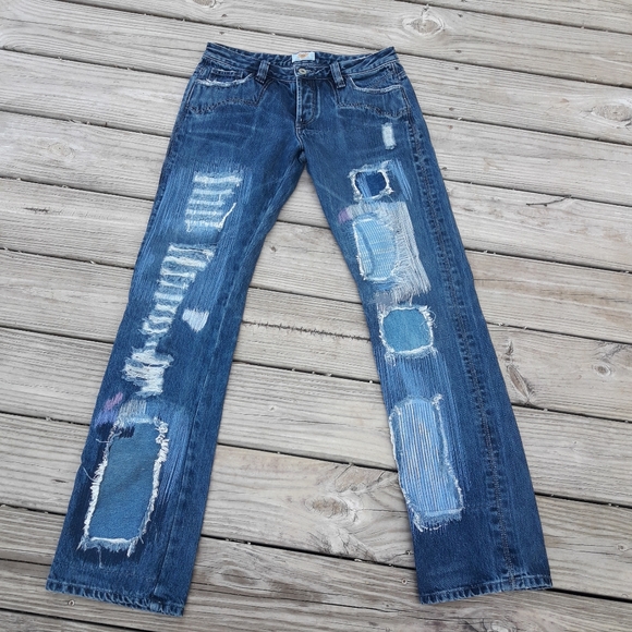 Patchwork jeans Straight Leg Machine Acid Wash Dyed Shashiko Embroidery Threading -Wonderful! New Vintage stock! NWT Vintage Jeans for women All Cotton Jeans w/ embroidered patch on front of both legs. Threading detail on back and on pockets. Patchwork has no holes through it as holed areas are reinforced with denim or fabric behind it-see up close photos. Unique denim appears slightly acid washed. Dark wash denim is gorgeous!