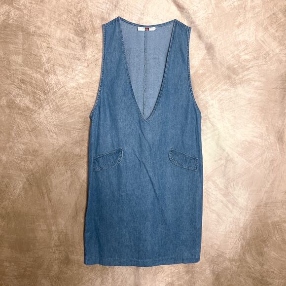 Midi shift style jean dress. Pullover style, deep v neckline. Small slit in the back. Vintage 1990s, made in USA.
