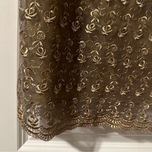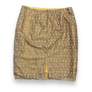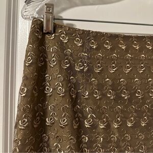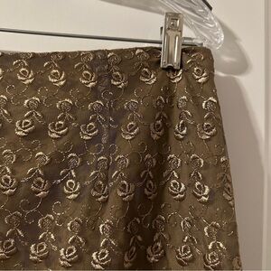 Vintage 90s/2000s brown skirt with allover gold floral embroidery. Back vent, fully lined, scalloped hem, zipper closure.
