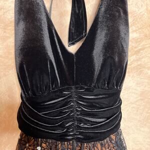 Dress has a velour ruched bodice, with a halter neckline. A line / fit & flare skirt with a tan / orange lining, and a black sheer mesh lace overlay with glitter and velour accents. Zipper closure. Vintage 1990s.