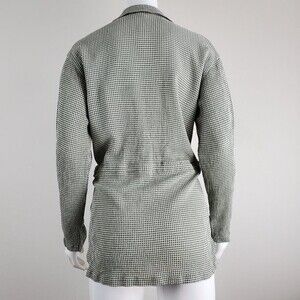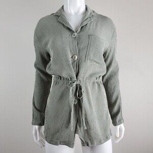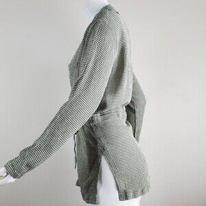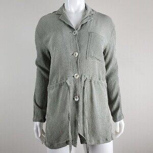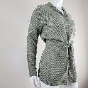 Vintage 90's Jones New York green & white gingham long-sleeved button-up blouse. Has 1 breast pocket, button closure, tie at waist (only cinches a bit), and side slits.