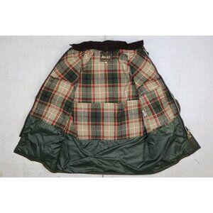 This Vintage 90s Joviel England Men's Small Waxed Hunting Jacket is a classic rain coat made of cotton canvas with a waxed finish, perfect for outdoor activities like walking, hunting, and hiking. The jacket features a zip and snap closure, a solid green color, and is lined with a blanket lining for added warmth. It is a timeless piece with a 90s theme, made in the United Kingdom by the brand Javiel. This long coat is ideal for all seasons and can be styled for casual, travel, or workwear occasions, adding a touch of vintage style to any wardrobe.