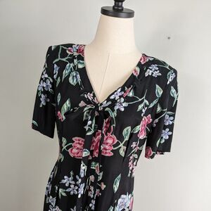 90s Y2K floral palazzo pants jumpsuit from Jamie Brooke, size 7/8. Pink, green, and blue floral on a black background. Ideal for cottagecore, feminine, dainty, romantic, and grunge vibes. Perfect for work/office, spring/summer, weekend, brunch, and church/worship.