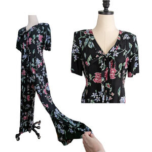Vintage 90s Jumpsuit Palazzo Pants Black 8 One Piece Floral Wide Leg Tie Grunge