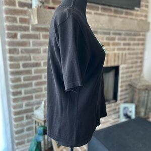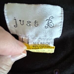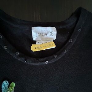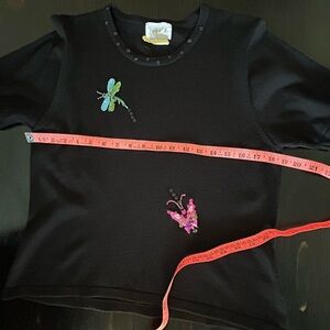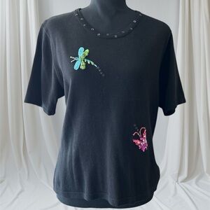 Vintage 90s Just B black embroidered bedazzled beaded short sleeve sweater. Little sequins and beads details on the collar. Embroidered and beaded blue, green dragonfly and pink, purple butterfly on the front. As on any vintage item there could be some loose or missing beads, I’m not aware of any, but please inspect photos prior to purchase.