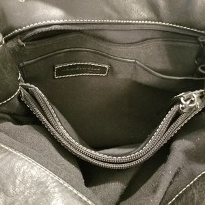 Black thick lambskin-soft leather satchel handbag with white contrast stiching, belt accent with silver buckle