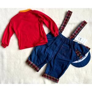 This set is incredibly vibrant and visually attractive and color theory matching, utilizing a classic primary palette (red, blue) accented by the bold plaid pattern. The Denim Overall are a soft denim with adjustable plaid suspenders and matching plaid cuffs. A fun embroidered Bear Appliqué with the phrase "New Kid in Town" is featured on the leg. The long-sleeve Red Top has snap closures at the neck and a yellow/orange mock collar. A matching denim and plaid Hat completes this adorable, coordinated vintage look.