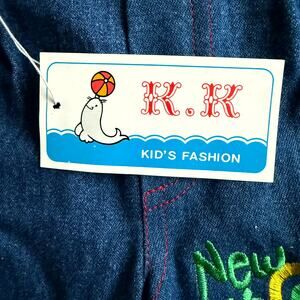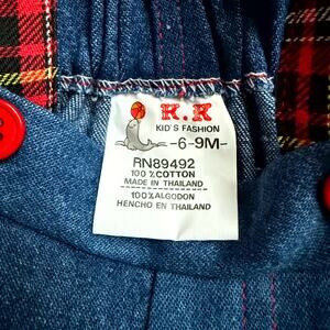 This fantastic vintage 90s K.K. Kid's Fashion outfit is an amazing 3-Piece Overall Set. The set features a unique combination of denim and plaid, making it a bold and playful look. It includes a long-sleeve top, denim overall pants, and a matching hat.