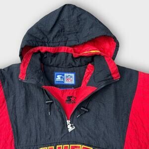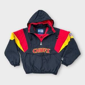 Amazing vintage 1990s Kansas City Chiefs Starter NFL coat in the 1/4 zip pullover style puffer with a hood and large front pocket. Adult size medium. This coat is in excellent preowned condition with no flaws, wear or issues. I will say that the white on the Chiefs logo is more of a cream versus a white, but It's all of it and not fabric discoloration or staining.