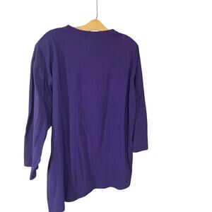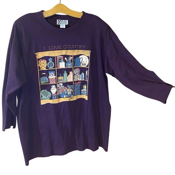 Vintage 90s Kavio Designs graphic long sleeve tee in a rich plum purple. Features a whimsical “I Love Country” shelf print with teddy bears, hearts, jars, and country cottage knick-knacks. Classic 90s Americana style, perfect for cottagecore, grannycore, or cozy loungewear.