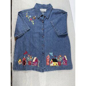 Vintage 90’s Keren Hart Women’s Denim Shirt Button Up Embroidered BirdHouse NWT