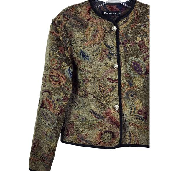 Vintage 90s Khanguru Green Floral Tapestry Classic Blazer Jacket XS made in USA