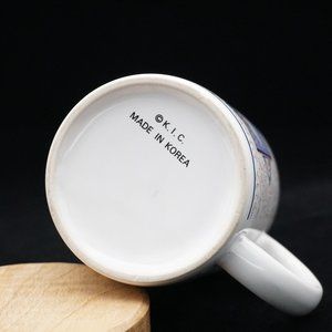 By K.I.C Made in Korea. The body of the mug is covered in a neutral floral print, and both sides are emblazoned with a sitting duck on a blue background, framed with pink roses.