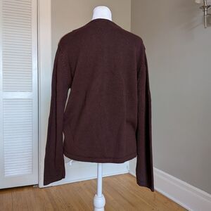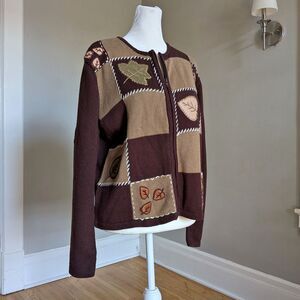 Vintage 1990s Joan Leslie knit cardigan sweater. Shades of brown with Autumn/fall leaves embellishment. Zip front. Tight knit. Unlined. Sweater is in good condition with light wear.