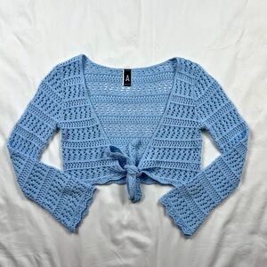 blue knit crochet style long sleeve cardigan from the brand “A Star”
