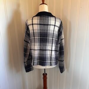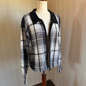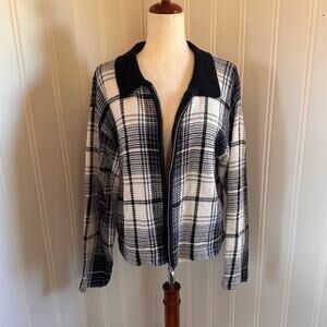 This vintage 90s Country Seat knit cardigan sweater is a size large. This cardigan has a blue, white, black and gray plaid pattern. It has a zipper closure, is a ramie/cotton lend and hand wash. This cardigan has twee vibes and is in good vintage condition.