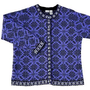 Vintage 1990s L.L. Bean Norwegian cardigan sweater, crafted from pure wool in purple and black with intricate Fair Isle, Nordic floral motifs. Celebrating Warmth, Quality and Timeless Winter Style. Features silver-tone pewter-style buttons and contrast trim. This collectible knit was made in Hong Kong. A perfect layering piece for the trending coquette ski lodge, après-ski, and Scandinavian boho looks. Seen in similar styles on Gilmore Girls (Rory’s winter outfits) and recently revived by brands like Doen, Sezane, and LoveShackFancy.