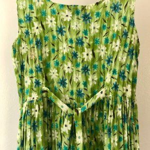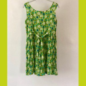 This pleated vintage 90s La Belle green floral dress radiates summer fun! Lime green printed with cream and blue colored flowers, the material feels like polyester crepe, though it is unlisted. Size is unlisted but the dress fits a size small or 4-6. Little to no stretch, with a tie around the backside for cinching.