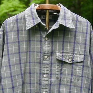 - Classic vintage 1990’s men’s 100% cotton neutral sage green and navy blue plaid flannel button front casual shirt by Land’s End