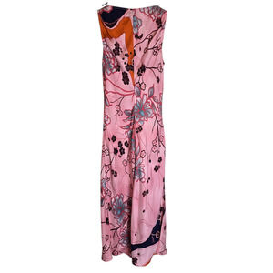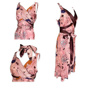 Rare design in the softest silk satin fabric. The dress features a very long sash at the bust that can be tied many ways to create a new look each wear. Included collage of how it can be worn. The print and overall cut of the dress lends a 1940s vibe as well. Such an incredible dress!