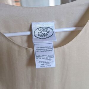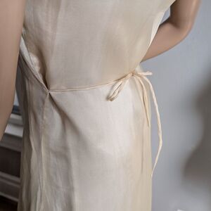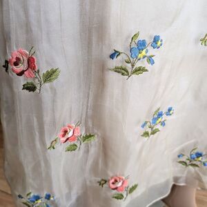 Vintage 1990s Laura Ashley maxi length silk dress. Semi-sheer cream/ivory overlay with lining underneath. Embroidered floral design at hem. Tie at back. Pullover. Sleeveless. Lightweight. Dress is in good vintage condition with some loose threads and wrinkles. Will need to be re-steamed after shipping.