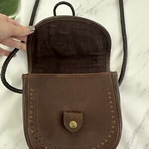 Vintage 90s dark brown leather braided strap cross body purse bag. It has some small scuffs, please see pictures. It measures about 8 inches tall, about 8 inches wide and about 2.5 inches deep.