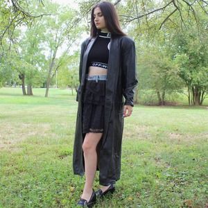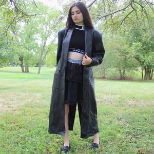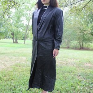 Vintage 90s Leather Trench Coat! The Spike Jacket (Buffy, obviously). Full length jacket with button up front by Sabrina! Size M, has shoulder pads!