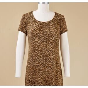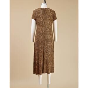 Vintage 1990's leopard dress with silver glitter. Slinky and stretchy knit fabric. Short sleeves. A-line silhouette. Midi length. Unlined.