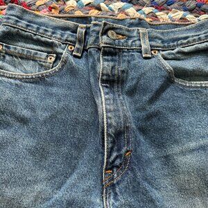 Vintage 90s medium wash Levi's 517 boot cut blue jeans. Classic 5-pocket style with a zip fly and belt loops. 100% cotton. Made in USA.