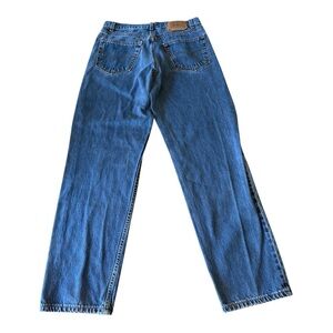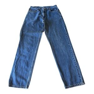The product is a pair of vintage 90's Levi’s 550 Relaxed Fit Jeans in size 33X32, made in the USA with a black care tag. These jeans feature a zip closure, mid-rise, straight leg style, and a 5-pocket design. They are made of denim fabric with a medium wash and come in a solid blue color. The jeans are machine washable and suitable for all seasons. The Levi's logo accents add to the classic vintage appeal of the piece, perfect for a 90's or early 2000 theme.