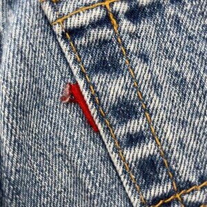 Condition: Preloved with red tag clipped, general wear, broken stitching, and cut-off hem/fraying.